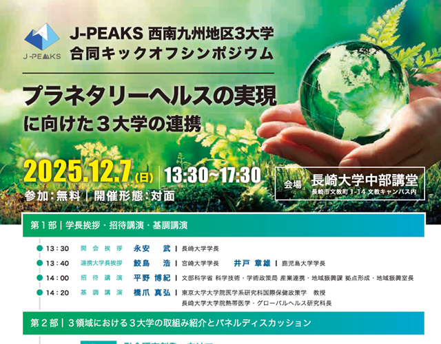 J-PEAKS 西南九州地区3大学合同キックオフシンポジウム「プラネタリーヘルスの実現に向けた3大学の連携」を開催します